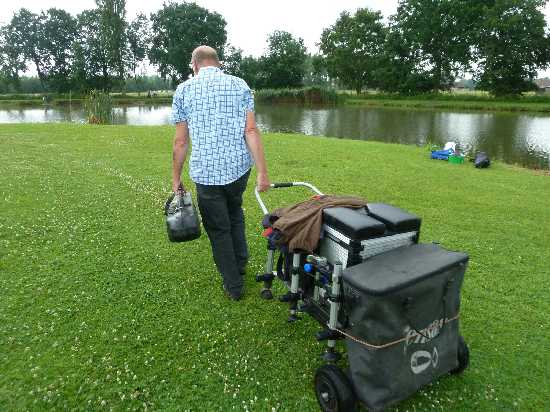 抽签已结束,大家就各自走向汽车,开始卸家伙事儿。阿曼德的行套是一个“拖车”加一个鱼竿包。所谓的“拖车”就是在铝合金钓台后面加了俩可拆卸的橡皮轱辘,鱼竿包是硬质塑料的。其他钓手的装备也大致差不多。卸车忙活了一阵子,大家开始拖着各自的钓具向各自抽到的钓位走去。