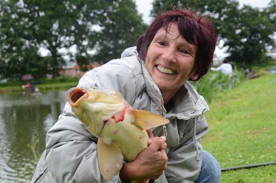 我赶快拎起相机朝纳迪娅的钓位跑,当我跑到纳迪娅身后时,她已经开始下抄网抄鱼了。纳迪娅钓到的这条鲤鱼可是不小,体长得有六、七十公分,估计体重得超过10公斤。由于鱼太大,纳迪娅连续抄了四、五次才将鱼抄到岸上。看到纳迪娅抱着大鱼高兴的样子,我不禁得连连摁下手中相机的快门,留住这快乐的瞬间。