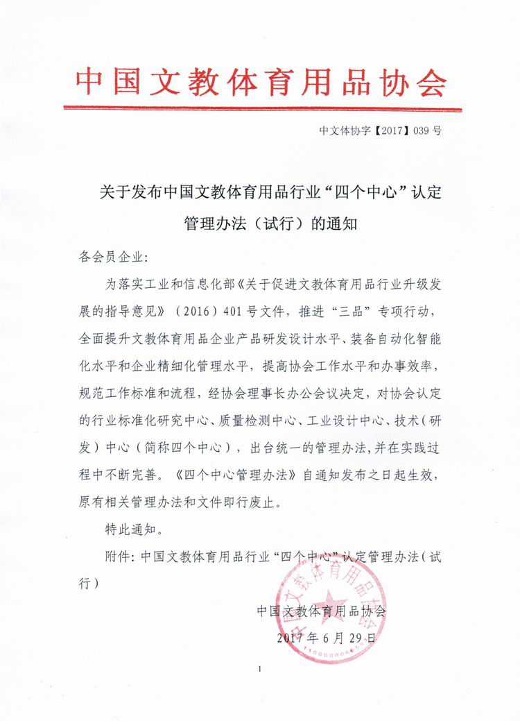 关于发布中国文教体育用品行业“四个中心”认定管理办法(试行)的通知